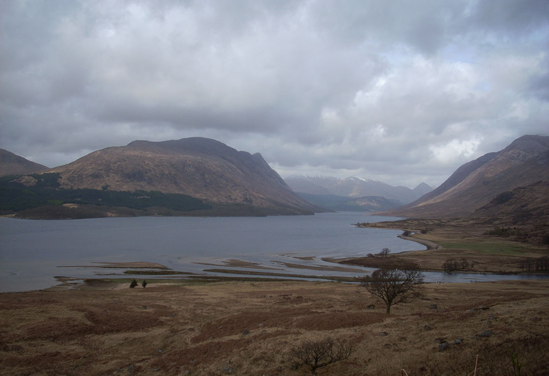 Loch Etive es uno de los grandes fiordos de la costa oeste. Está a cota cero y su agua es marina pero se introduce muchos kms. tierra adentro. La ruta recorre su orilla meridional aprovechando la pista que da acceso a algunas granjas. La civilización (la carretera de Oban) aún está cerca pero este lugar ya tiene ese aura aislada y evocadora tan típica de estas tierras. La imagen está tomada hacia la parte interior del loch, cuando éste toma orientación norte y justo antes de que mi ruta lo abandone hacia el este para empezar a ascender a lo largo de Glen Kinglass.
