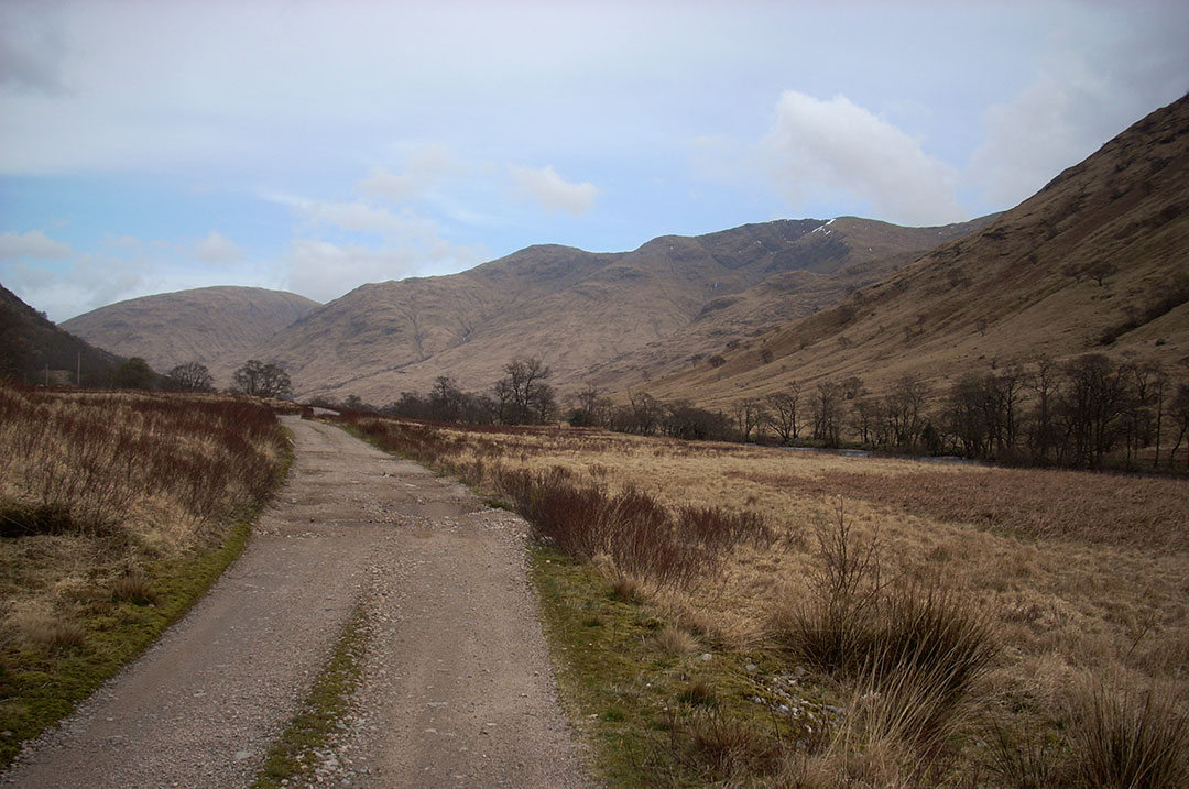 Glen Kinglass es el valle que utilizaré para abandonar Loch Etive y adentrarme en las tierras altas. Típicamente escocés, Glen Kinglass es un valle glacial con fondo plano y empinadas paredes. Ahora deshabitado, aún conserva una pista en sus primeros kms. como acceso a una granja en la que ya no vive nadie.