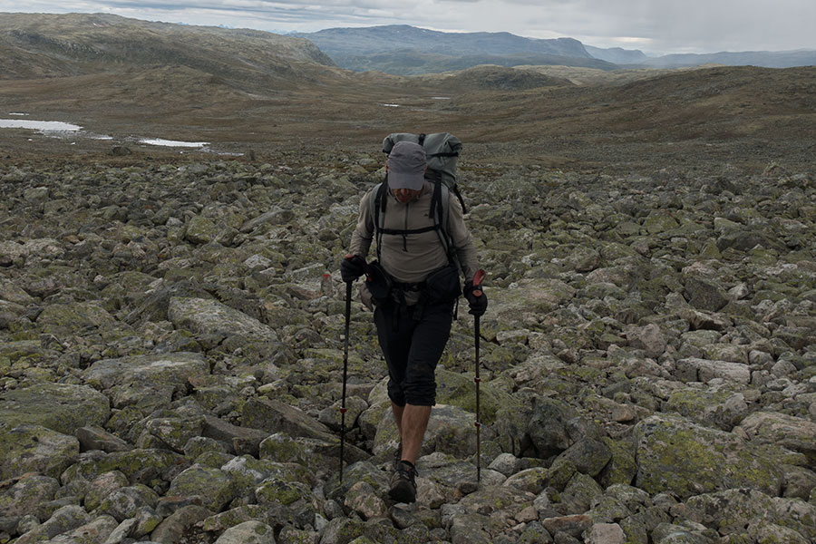 Esto implicaba un reto interesante: tenía que llegar a ese punto con un colchón suficiente para sentirme seguro de continuar y no liarla. En Noruega, es relativamente sencillo que una combinación de terreno y meteo complicados fuercen retrasos. Siendo un viaje relativamente corto, de sólo dos semanas, fui a por todo desde el primer día y, especialmente, aproveché una ventana de tiempo estable y el terreno propicio de Hardangervidda para conseguir ese colchón. Había previsión de tiempo lluvioso para los últimos días pero lo vi posible.