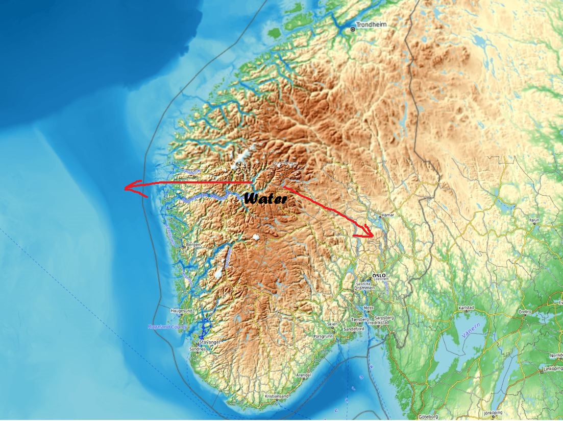 No es una divisoria de aguas muy evidente la de la mitad sur de Noruega porque, hacia uno de los dos lados, las montañas llegan prácticamente hasta el mar pero no deja de haber una línea de montañas y tierras altas desde las que el agua fluye hacia este u oeste. Tradicionalmente, una divisoria de aguas es terreno de primera para caminar.