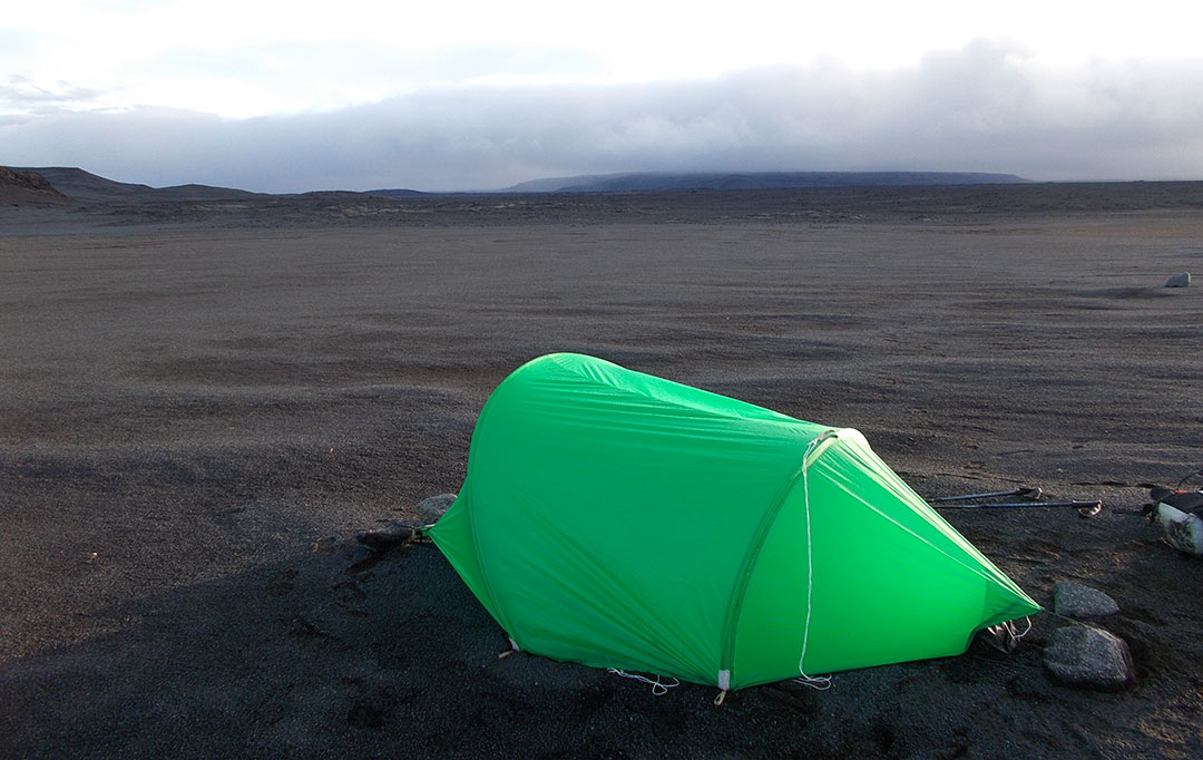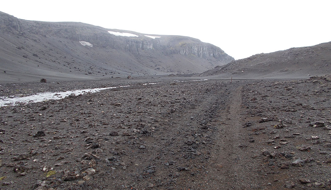 I’m still skirting the Askja western slopes when I meet two other backpackers coming north. They’re heading for Dingjufell tonight and I’m happy to announce it’s an easy, mostly downhill, beautiful hike and a great place to spend the night. They’re on the same journey as myself, just northbound and on a less demanding schedule and more traditional packing approach. They have already crossed most of the highland section and bring me interesting news of what comes ahead, most of them reassuring. They’ve been on good tracks all the way with just a few tricky, not too dangerous fords. The track skirting the Vatnajokull that I was most concerned about is just as good as the one we’re standing on. Out of the two mapped huts further south, there’s one that is open to the public, the other is not. They haven’t tried the most logical, direct route along the western end of the big icecap due to advice from rangers about the potentially dangerous fords on the way. It’s the same advice I’ve got.