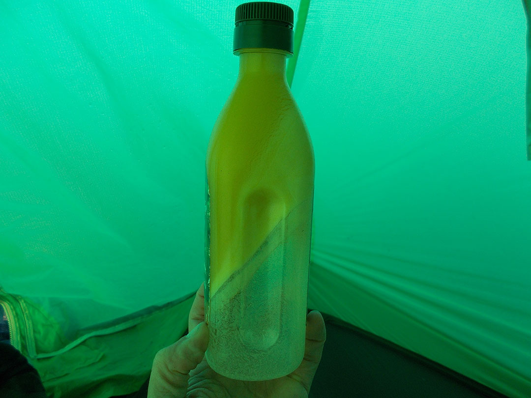 The lack of clouds lowered the temps during the night down to almost freezing. Water didn’t freeze but the olive oil did: