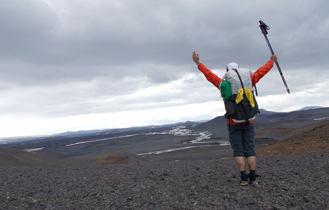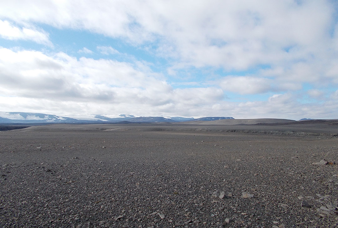 Coming out of the riverbed, I aim for higher ground for a view ahead. My intended route squeezes between the Vatnajokull on the east and the Tungnafellsjokull on the west. It’s stunningly beautiful land and it shines bright under the sun. I tread on the known mix of gravel on top of sand, a bit on the soft side but mostly fine walking. It’s neat to be off-trail in such an open land where there are literally no barriers for endless miles.