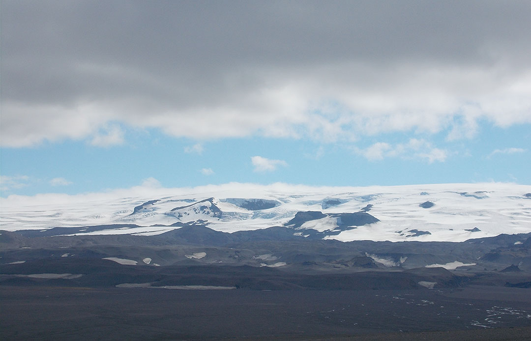 Brilliant blue skies at last. Vatnajokull hides behind low cloud