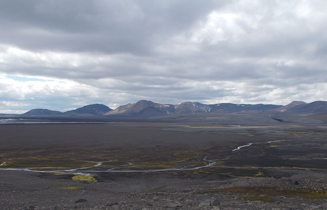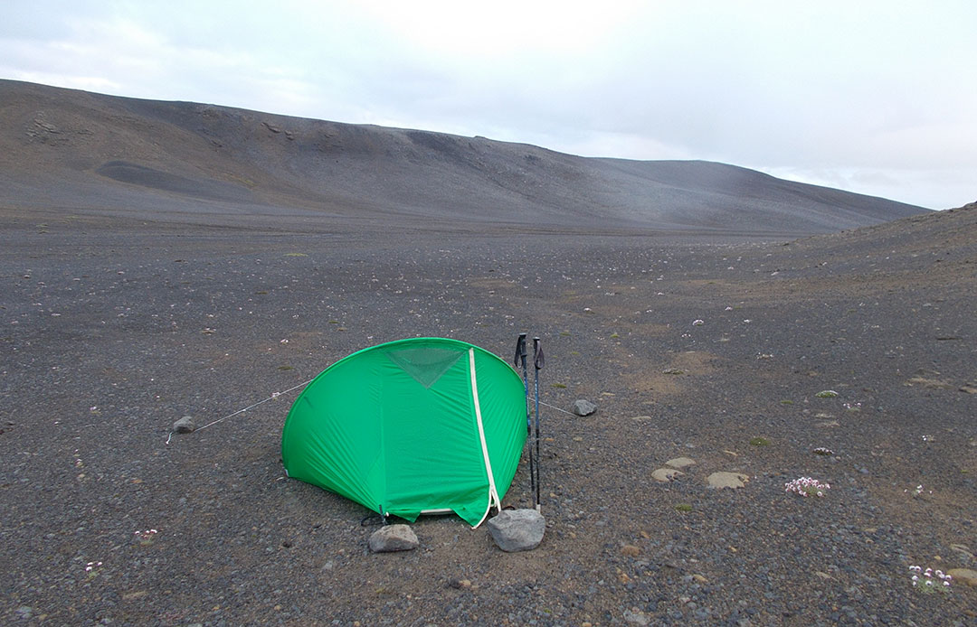The track is as good as it can be. The landscape is far bleaker than the Vonarskard, rather dark rock, sand and gravel in a hilly environment. It’s been getting cloudy, now it’s already overcast. I keep hiking to day’s end and pitch in a hardly inspiring but sheltered shallow valley. This is part of the deal: at roughly 30 miles per day, I can’t choose where to camp. I stop when and not where.