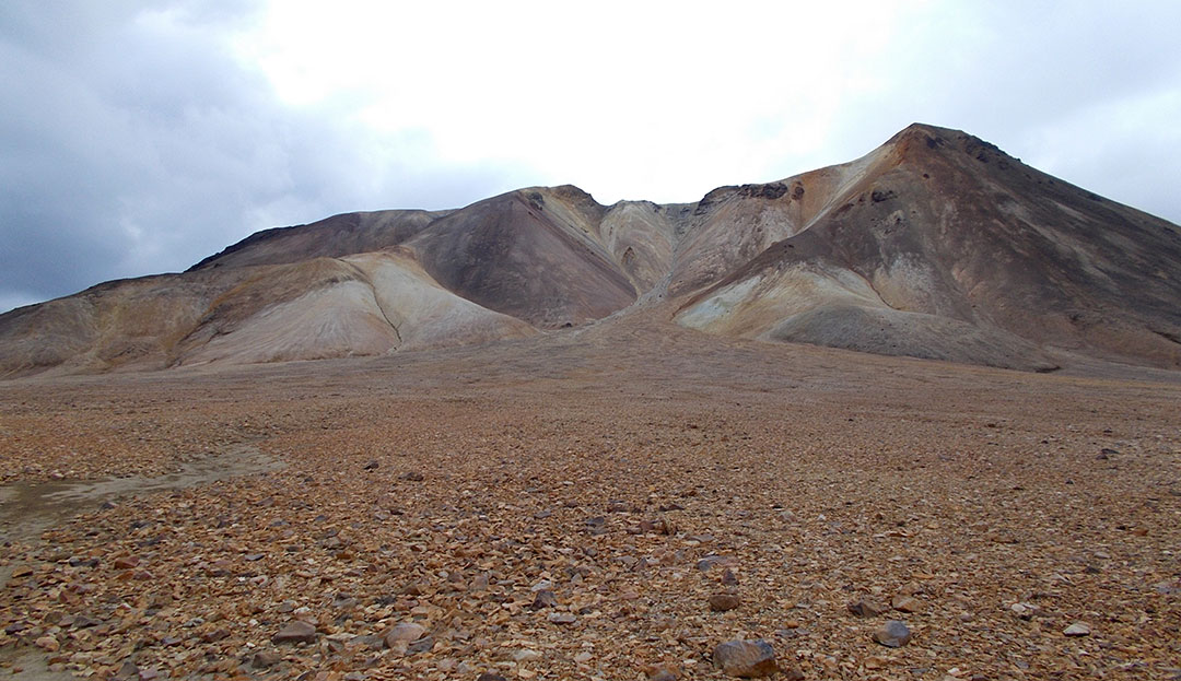 Nyidalur is a summer outpost on the F26, it’s right behind those rhyolite mountains to the west. There is a trail across the mountains that gets there. This was my intended alternative to the icecap-side, potentially dangerous Jokulheimar route. There is a hut at Nyidalur and a daily highland bus stops there. There must not be much more to it but hikers commonly use Nyidalur for a resupply by sending a parcel there. I didn’t mean to do that so I have no real need to go through. There’s a technically better alternative that’s shorter and saves me a good part of the long trudge along the F26. It involves crossing the Vonarskard the same as in the Jokulheimar route but then taking a track out to the F26 along the massive Hagongulon lake.