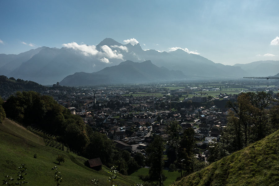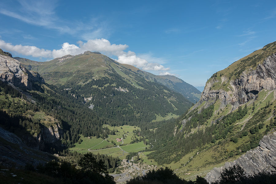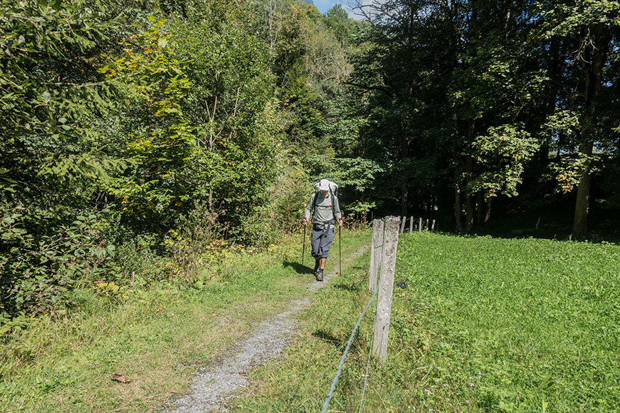 Sargans and nearby Mels sit in a wide, oddly flat valley confluence flanked by high peaks. The Via Alpina 1 enters the mountains along the Weisstannental in a course due west. This valley is narrow and deep, with a public road near stream level. The trail takes a different course on the upper floor, i.e. it makes an initial climb to the south-side slopes, then traverses along, linking the small communities and farms clinging to the hillside.