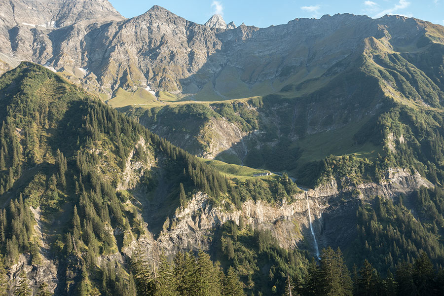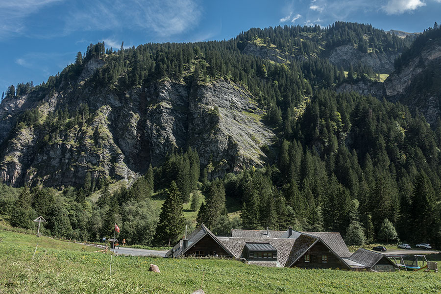 Further upstream, the route comes down to meet the valley floor and the highest villages, Schwendi and Weisstannen while progressing through the woods. The road is still there but remains mostly unnoticed. There’s yet more tarmac past Alp Vorsiez, where there’s lodging and a restaurant that I don’t visit. Here the seclusion ends as the trail emerges from the depths and the valley ups one level.