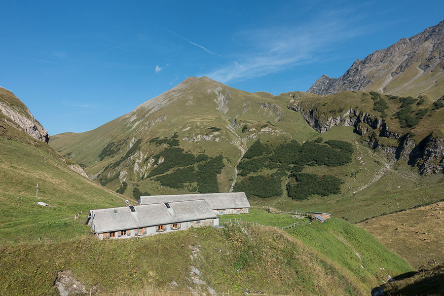Now in a magnificent scenario of mountains all around, high on the slopes above the highest reaches of the Weisstannental, the trail turns to a path and gets to Foo Alp, on a bench above the headwaters, a mix of alp farm and recreational mountain hut -there’s both. Past Foo Alp, it’s all grassy slopes in search of the first pass on the trip.
