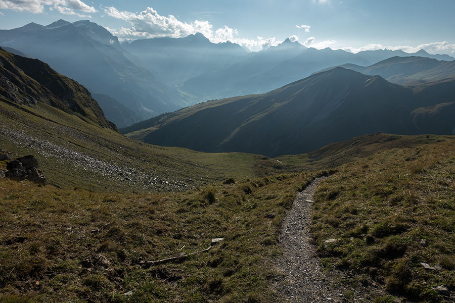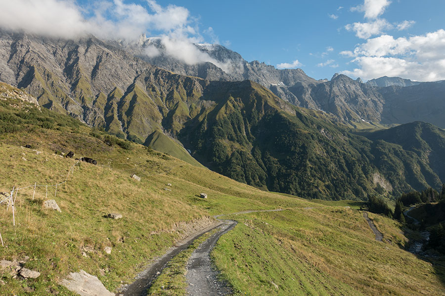 Down in the first basin after the pass there’s another alp location and the trail turns into a dirt road. I have mixed feelings about such an early end to the wilderness. It certainly makes for quick progress down.