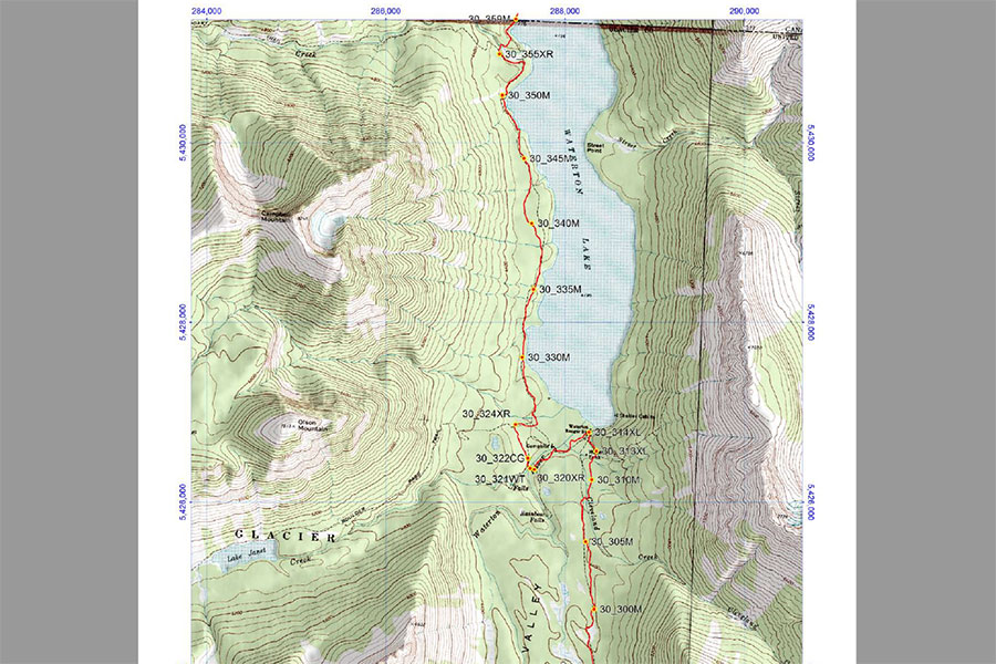 Bear Creek has printed waypoints with codified key information about water access, trail heads and other useful info. Waypoints also show total northbound mileage. There’s also a UTM grid drawn over the margins and across the map.